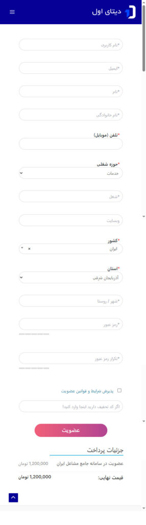 در این بخش شما باید فرمی که مطابق تصویر شماره 3 مشاهده میکنید را پر کنید و ادامه تیک پذیرش قوانین و شرایط عضویت را بزنید و در مرحله آخر بر روی دکمه عضویت بزنید و به صفحه پرداخت بانکی هدایت خواهید شد.