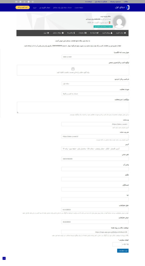- وب سایت: اگر وب سایت دارید آدرس آنرا وارد نمایید. (همچنین اگر وب سایت ندارید میتوانید از بخش خدمات دیتای اول برای مشاغل به ما سفارش دهید تا وب سایت شما را برایتان طراحی کنیم.)